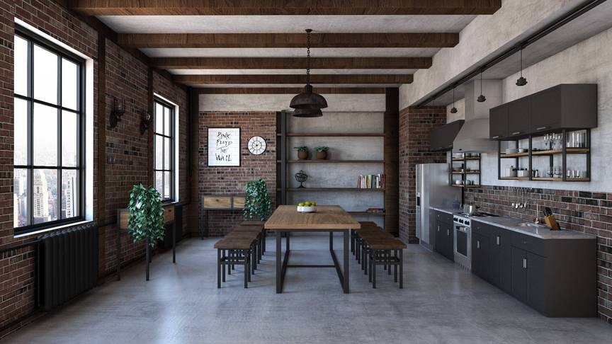 Лофт прекрасно подходит для оформления кухни-столовой площадью 12 км. м. Подчеркнуть эффект промышленного пространства помогут полиуретановые фальш-балки на потолке, имитирующие натуральную либо выбеленную древесину.