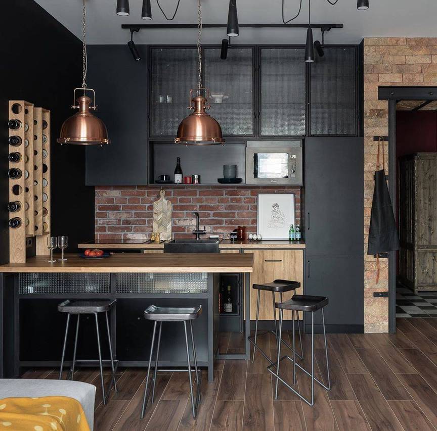 Кухня размером 9 кв.м. считается достаточно просторной. Воссоздать лофт дизайн в таком помещении проще, чем на 6 кв.м. Помимо рабочей зоны здесь можно создать уютный обеденный уголок. Позаботиться о грамотно выполненном зонировании.