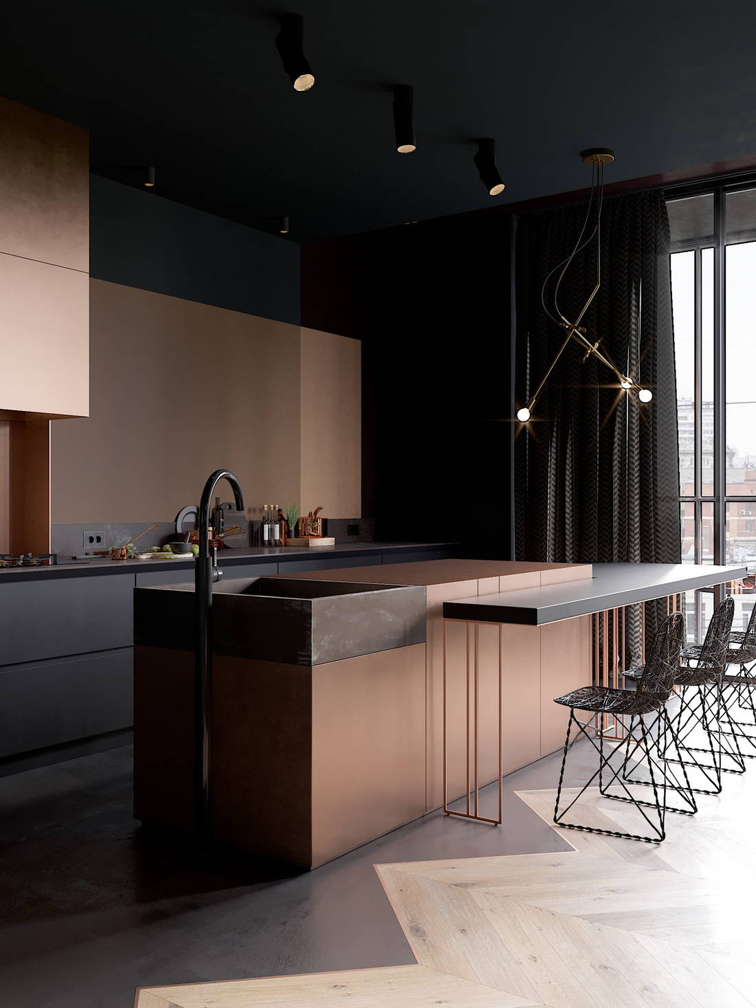 Традиционно кухня лофт исполнена в темных натуральных цветах, и связано это с особенностями самого стиля – поверхность стен и потолка не подвергается сложной отделке, а оставляется в натуральном виде, а, значит, это дерево, металл, кирпич, бетон и камни. Темные стены и потолок не будут «давить» и угнетать, если в кухне присутствует хорошее естественное освещение. Акцентом в такой кухне становится кухонный гарнитур и мебель ярких цветов.