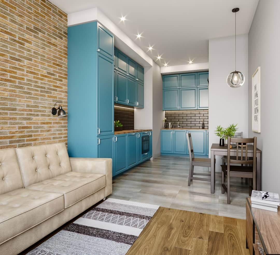 Кухня-гостиная в стиле прованс с декоративной каменной кладкой.