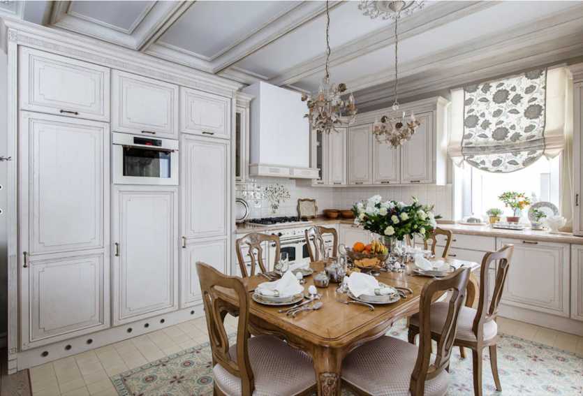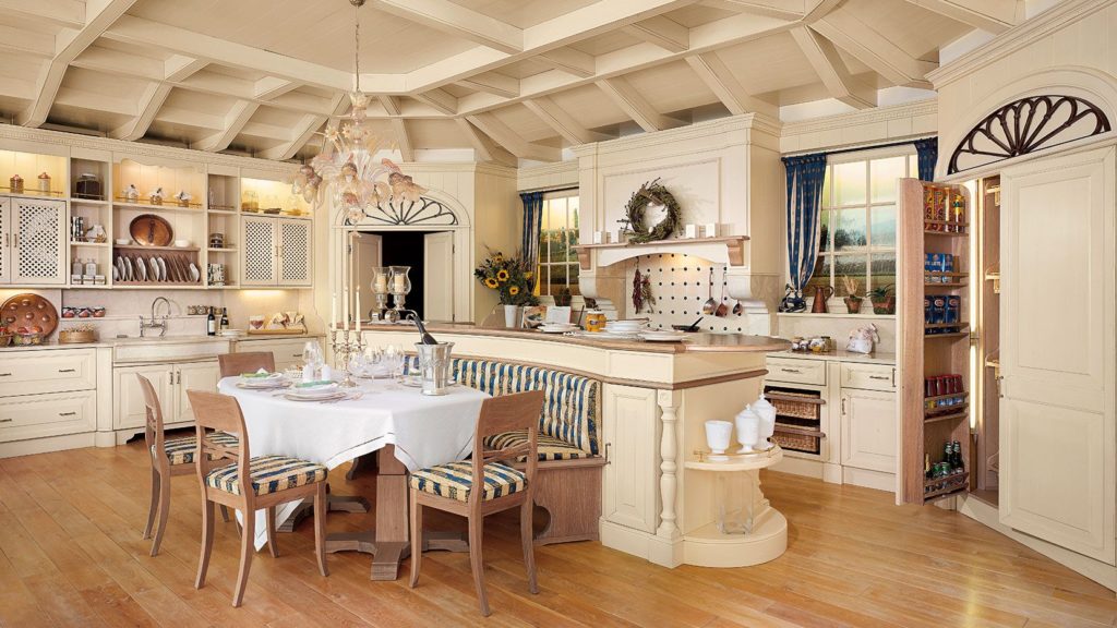 Кухонный фартук следует обустроить с применением керамической плитки, также подойдет искусственный камень. Окна можно украсить длинными легкими портьерами светлого цвета. Прямо над обеденным столом стоит расположить большую подвесную хрустальную люстру.