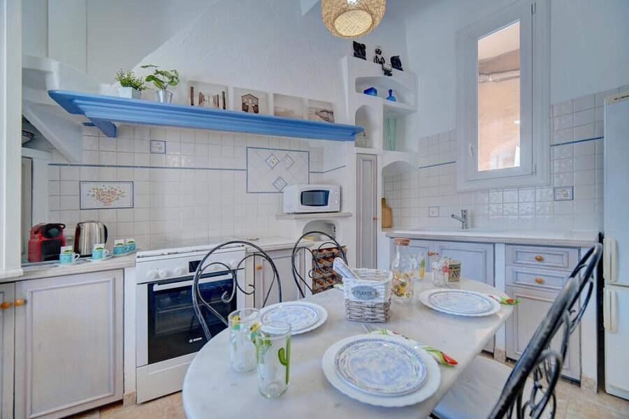В такой большой комнате можно с легкостью поставить большой круглый стол из дерева и окружить его кованными стульями для удобства всей семьи и гостей, что так характерно для гостеприимного французского средиземноморского берега.