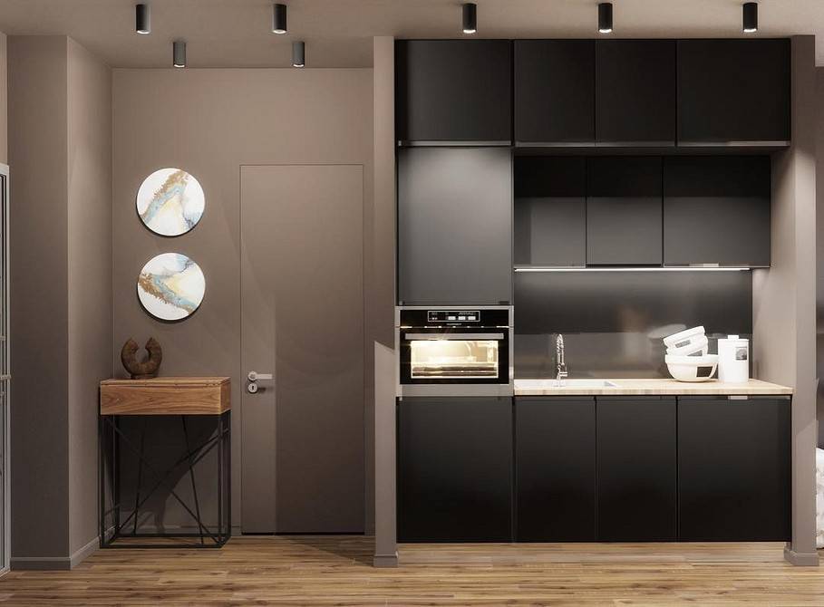 Если в студии комната слишком мала, то аккуратная кухня-ниша в коридоре решит проблему с обустройством зоны готовки. Есть и совсем компактные варианты углубления в стене, как на первом фото.
