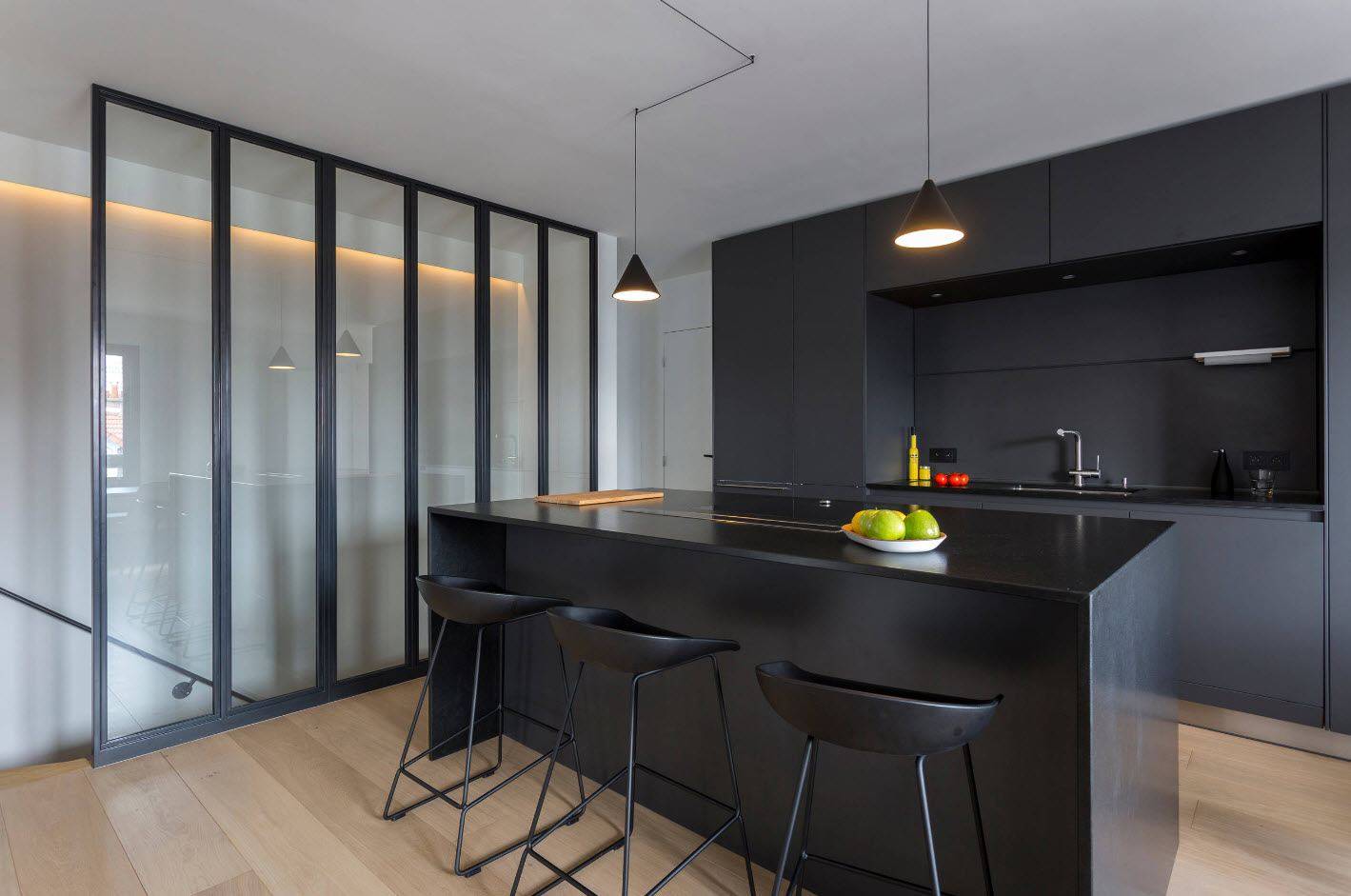 А кухня скрывается за складывающейся панель. Идеальное решения для лофта, где кухня часто совмещается со спальной и гостиной