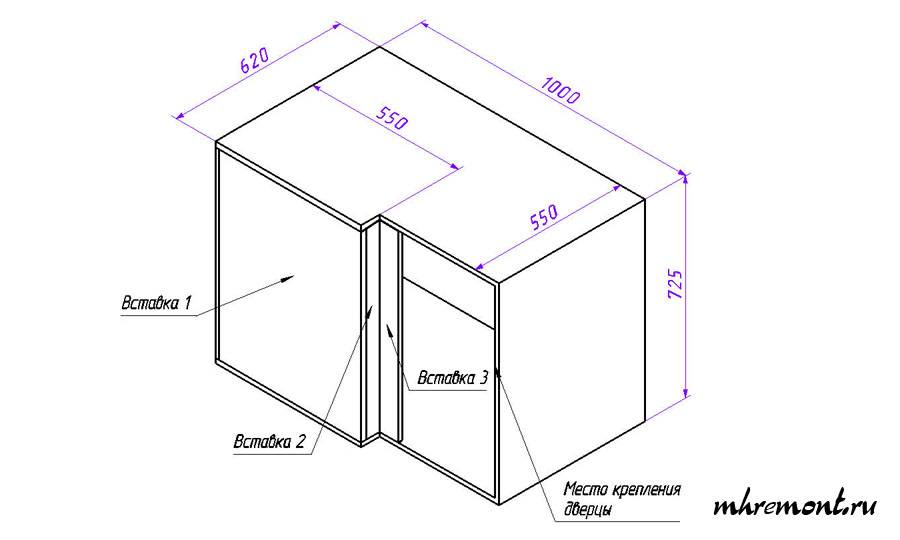 Рис.2. Прямой угловой кухонный шкаф чертеж. Нижний ряд.