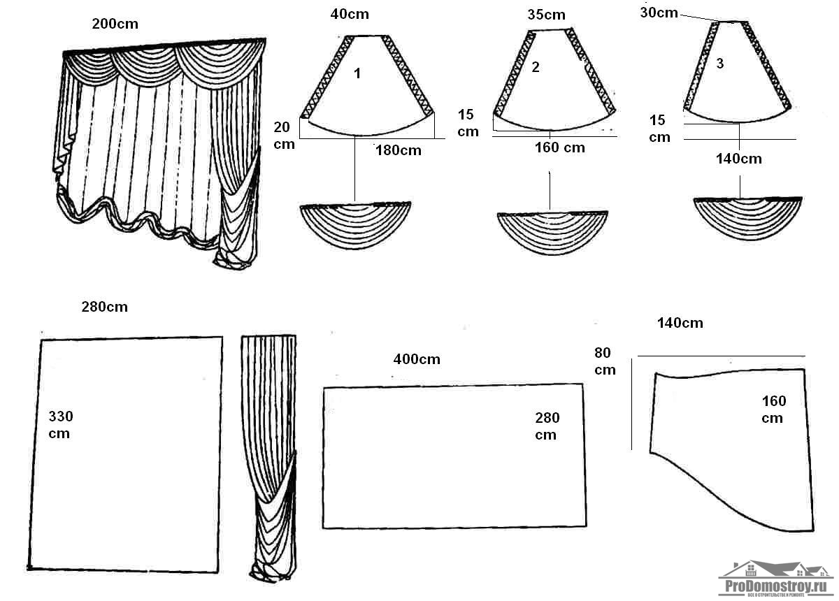 Эта модель шторы также очень простая. Выкройка такого полукруга представляет собой трапецию. Высота трапеции должна быть равна высоте готового изделия х 1,5. Длину трапеции нужно выбрать в соответствии с длиной вашего карниза и общим количеством полукруглых элементов в ламбрекене.