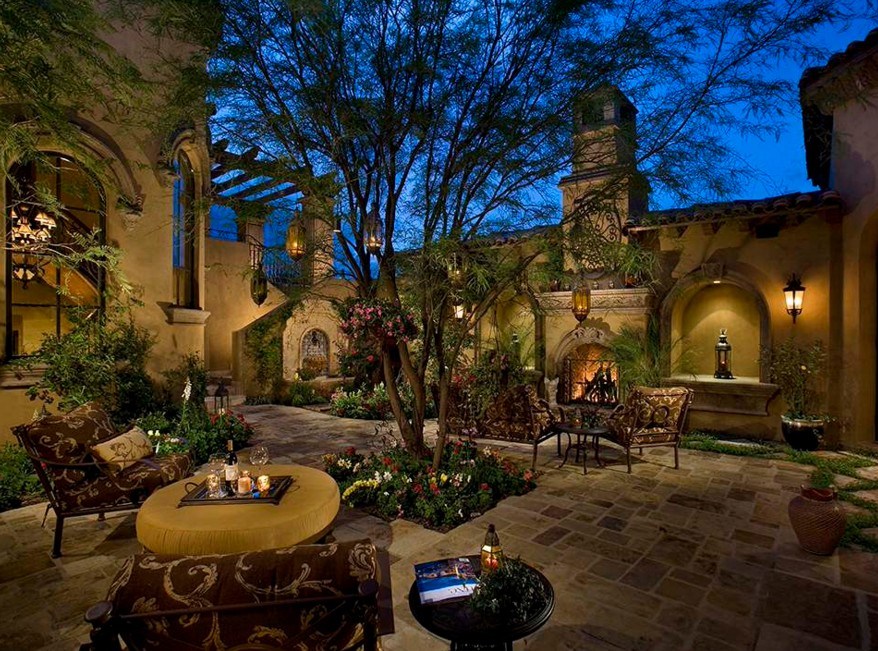 Средиземноморский стиль. Ландшафтный дизайн двора частного дома, оформленный в этом направлении, предусматривает оформление участка по общим принципам, либо в духе конкретной страны — Италии, Греции и др. Основные цвета стиля, в которые должны быть окрашены постройки — белый, голубой и желтый. Поскольку основным принципом является единство ландшафта с небом и морем, наилучшим вариантом для такого оформления станет участок на вершине холма или склона, откуда открывается вид на дальние горизонты. На территории участка удачно будут смотреться живописные руины, созданные из фрагментов фасадных украшений, осколков глиняной посуды, а также стилизованные римские колонны
