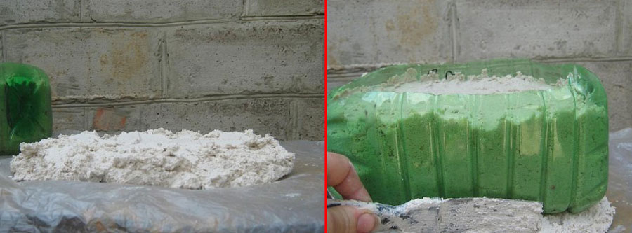 Взять часть шпаклевки, выложить её на заранее приготовленную пленку равномерным слоем толщиной 5 сантиметров. Сверху, на шпатлевку, положить и плотно прижать бутыль. Все излишки, которые приподнимутся, аккуратно разгладить вверх по бутылке. Наиболее удобно проделывать данную операцию при помощи шпателя. Помните, для того что бы шпаклевка ни прилипала к рабочей поверхности, шпатель необходимо периодически окунать в воду.