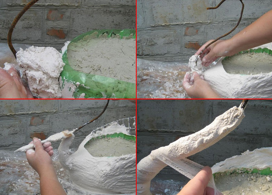 Вдавите в шпаклевку по бокам металлическую сетку и придерживайте какое-то время. Необходимо дождаться пока наши будущие крылья приклеятся. Далее очень кропотливо, мокрыми руками, формируем из шпаклевки крылья. Технология проста: одной рукой, сверху, шпаклевка наносится на сетку, другой рукой, с оборотной стороны поддерживается. Используя туже технологию, из сетки и шпаклевки, изготавливается хвост лебедя.