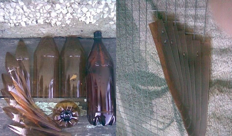 - Разрежьте бутылку на части, формируя перья птицы. Из одной бутылки обычно выходит около пяти перьев. С любой стороны пера сделайте четыре отверстия, в которые вставляется проволока сетки.