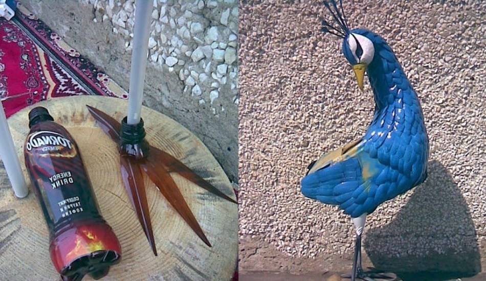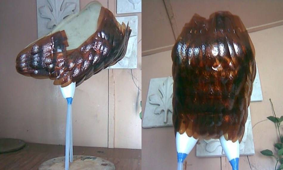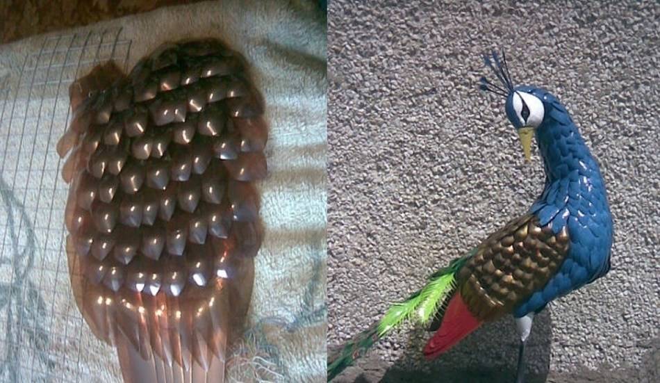 - Хвост птицы изготавливается аналогичным образом. Перья, вырезанные из пластиковых бутылок, просто прикручиваются к сетке.