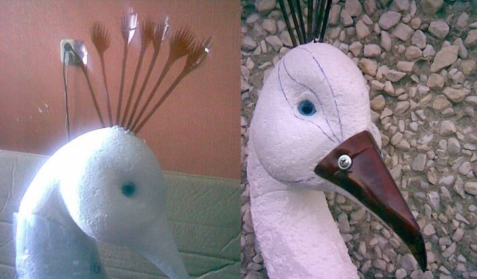 - Из куска пенопласта необходимо вырезать голову и клюв. Детали следует обработать наждачной бумагой, чтобы исчезли все неровности.