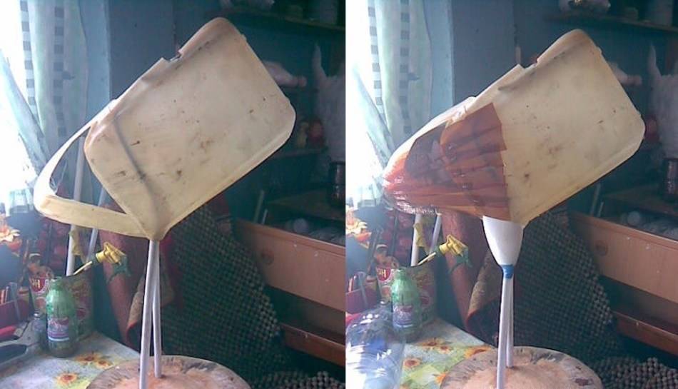 Его можно изготовить из пластиковой бутылки или проволоки и обмотать пакетами, бумагой и скотчем, придавая форму.