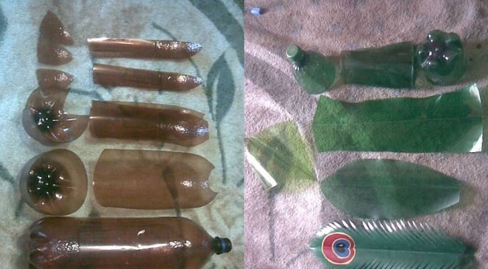 При расчете количества бутылок следует принять во внимание тот факт, что одна емкость станет основой для 5 – 6 перьев. Из нее вырезаются подобные лепесткам элементы одинакового размера, на которых создаются по 4 отверстия для фиксации на сетке