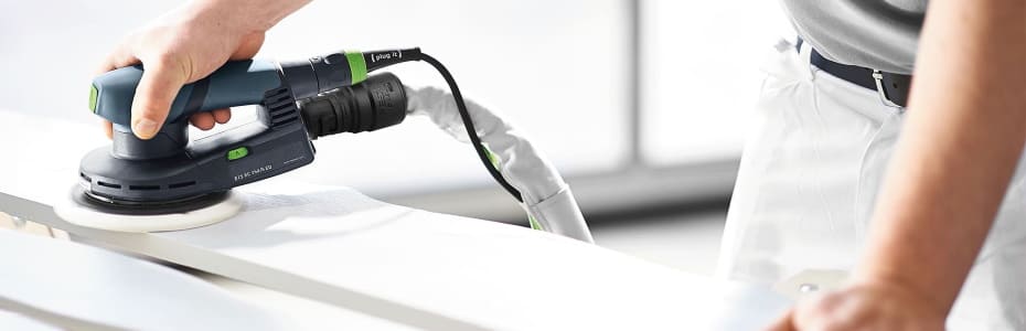 - Эксцентриковая шлифмашина – используется для шлифования плоских, закругленных поверхностей. Обладает самой высокой точностью. Однако подошва не достигает труднодоступных мест, углов. Ручная машинка оснащена круглым диском, работающим в колебательном и вращающемся движении одновременно, в зависимости от давления. Проста в использовании, но требует немного большего внимания, чем осцилляционная. Инструмент держат обеими руками. Благодаря сочетанию двух движений пластины модель эффективна, быстра, производительна, при умелом использовании не оставляет видимых следов шлифовки.