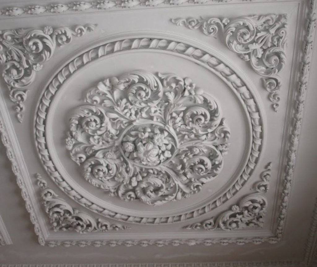 Ценители подлинной красоты по достоинству оценят лепнину на потолке, выполненную из натурального природного гипса. Этот удивительный материал в полной мере передает красоту пластичной, «живой» архитектуры. Мелкая фракция гипса позволяет создавать особо прочный декор с идеально гладкой поверхностью.