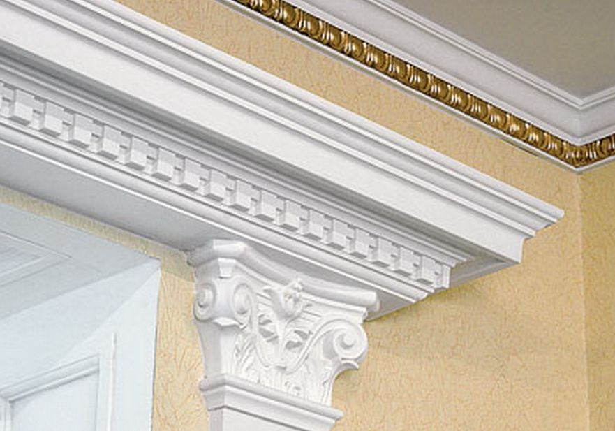 Данные декоративные элементы выполняют не только эстетическую функцию, но и практическую – с их помощью можно скрыть некоторые дефекты на потолке и замаскировать стык со стеной. Каждый элемент имеет свое название – колонна, карниз, пилястра, розетка, барельеф и другие.