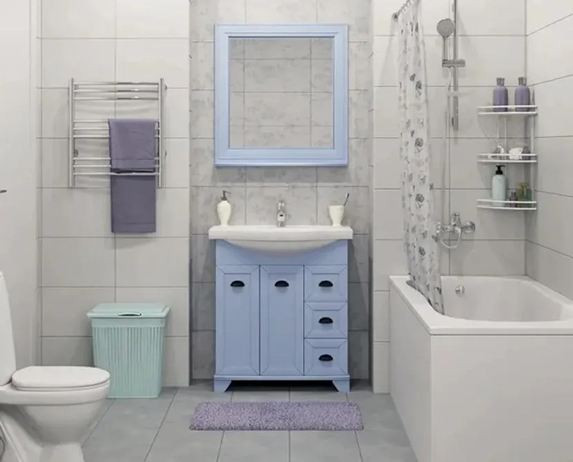 - Мебель: напольные и подвесные тумбы под раковину, шкафы, пеналы, шкафчики. Наполнение для шкафов: корзины для белья, лотки, органайзеры, держатели.