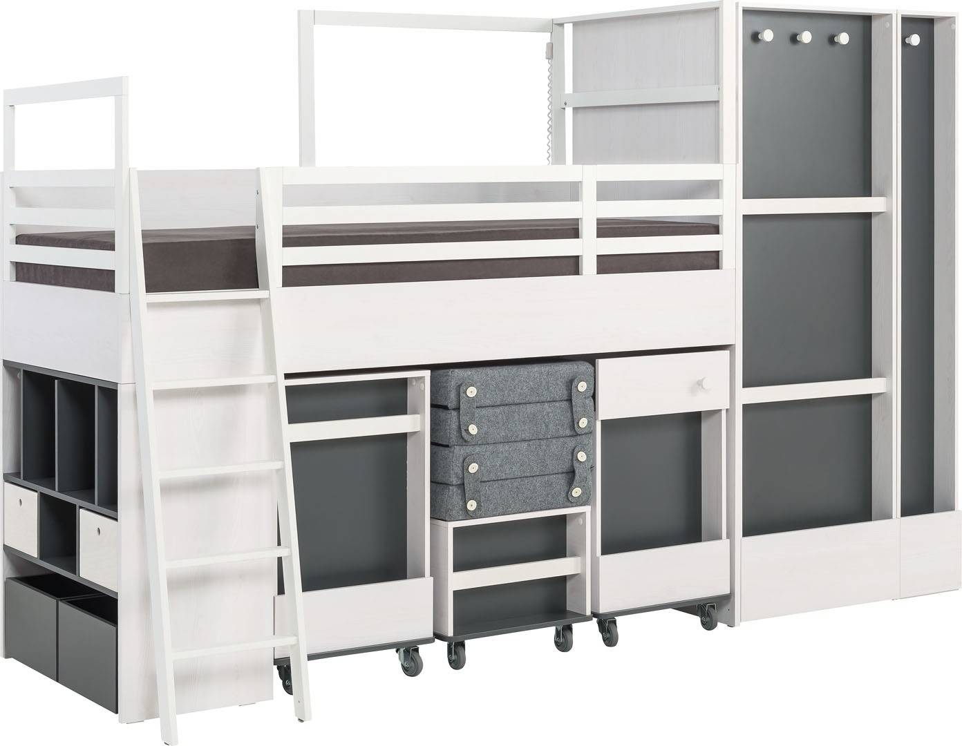Кровать-чердак комбинируют с разными предметами мебели: рабочий стол, второе спальное место, стеллажи для книг и игрушек, шкафы или комод для одежды, спортивный комплекс.
