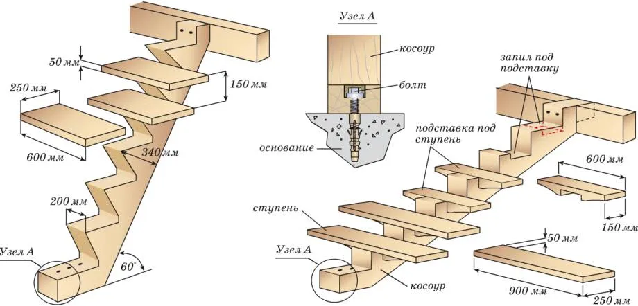 Конструкция с использованием треугольных кобылок является более надежной. Кобылки крепятся с использованием шкантов, для которых предварительно делаются пазы. Наиболее прочная конструкция получается с использованием кобылок сложной формы, при этом на косоурах делается специальный вырез. Соединение элементов лестницы осуществляется при помощи клея и саморезов.