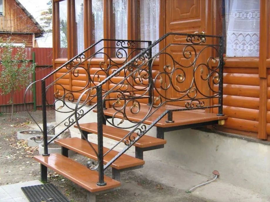 В некоторых случаях из металла изготавливают только опорный каркас, в других металлическое крыльцо для дачи аналогично деревянному, в третьих сооружают монументальную конструкцию на фундаменте, украшая ее красивыми кованными деталями.