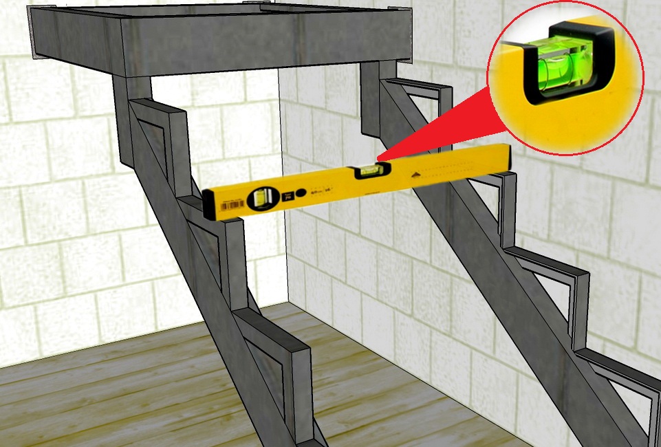 Если имеются отклонения от линии горизонта, их необходимо устранить, в противном случае ступени будут иметь уклон или перекос и это может вносить определенный дискомфорт при перемещении по таким ступеням. Далее приступаем к установке опорных уголков (перемычек) для ступеней лестницы.