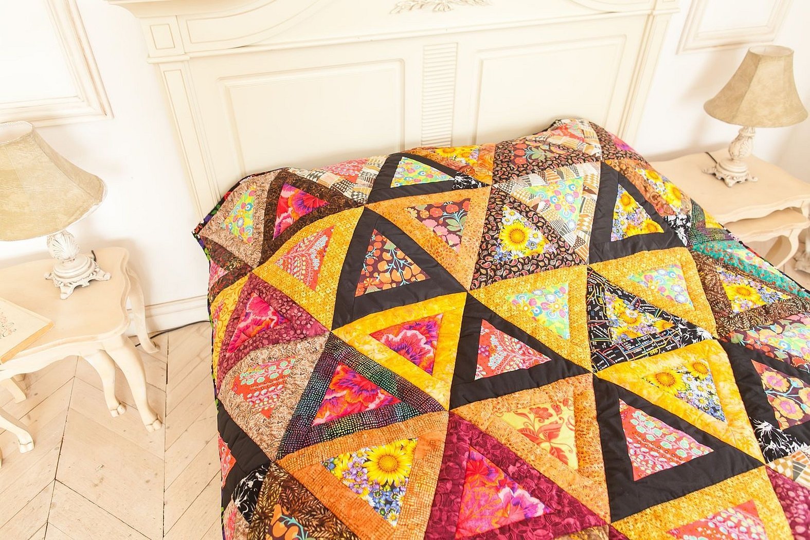 Тут все создается из треугольников, которые по диагонали образуют одинаковые полосы, а затем сшиваются и образуют цельное полотно.