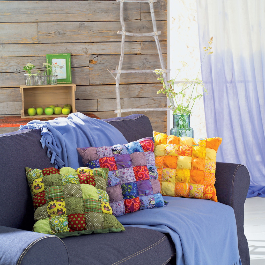 Используя лоскутное шитье, можно создать яркие аксессуары для интерьера