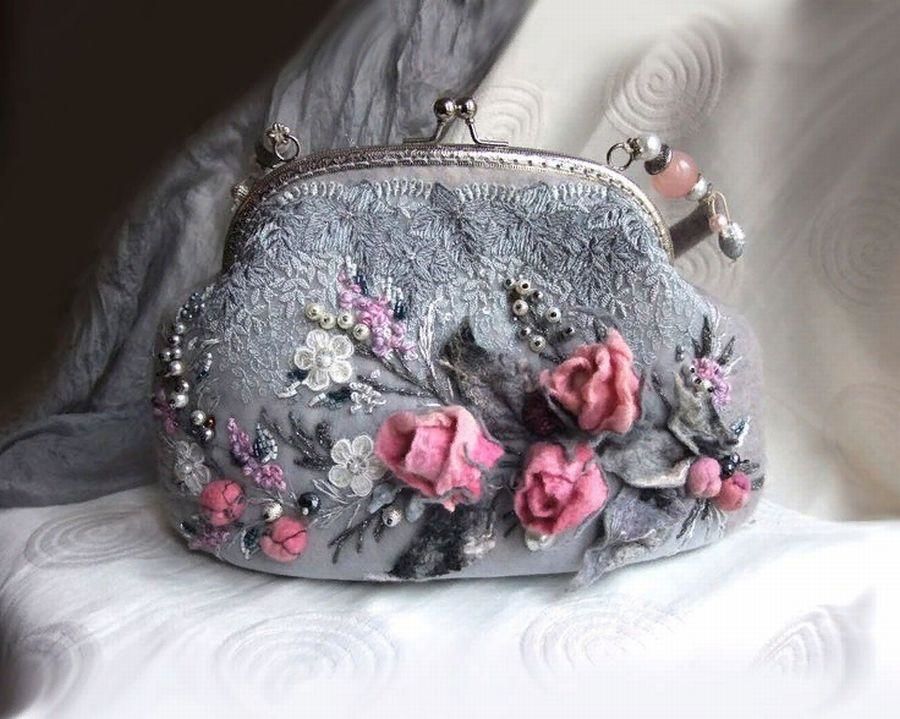 Очень элегантный дизайн косметички. Светло серая ткань, обильно украшенная тесненным узором в виде листьев и объемными розовыми цветами, в сочетании с бусинами создают настоящую весеннюю композицию.