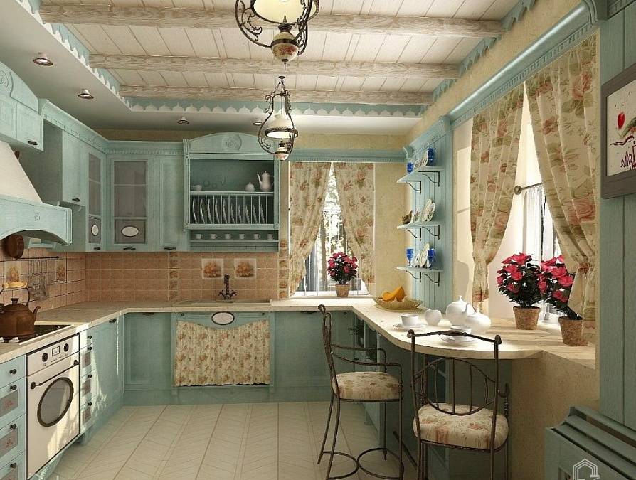 Прованс в интерьере кухни – это всегда обилие света, открытости, простора. Очень часто кухню совмещают со столовой. Основной проблемой для создания очаровательного сельского стиля станет маскировка современной техники. Для решения этого вопроса техника либо прячется за фасадами, либо ей придается старинный вид.
