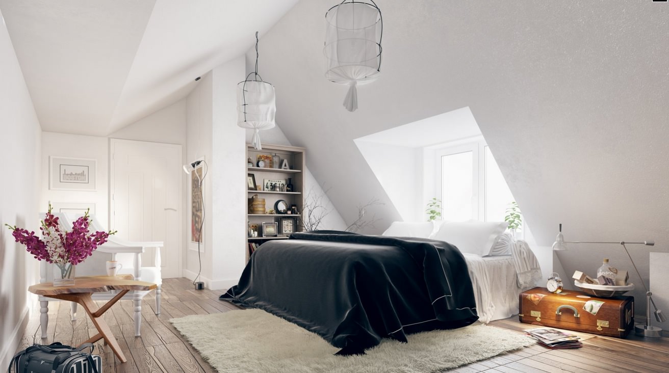 Иногда кровать устанавливают не в центре комнаты. В больших помещениях оставляют пространство для рабочего стола или зоны отдыха. А в маленьких комнатах сдвигают спальное место, чтобы расположить остальную мебель и не загораживать проход. Если подвесить люстру в центральной точке, она будет выглядеть несимметрично, поэтому лучше разместить над кроватью.
