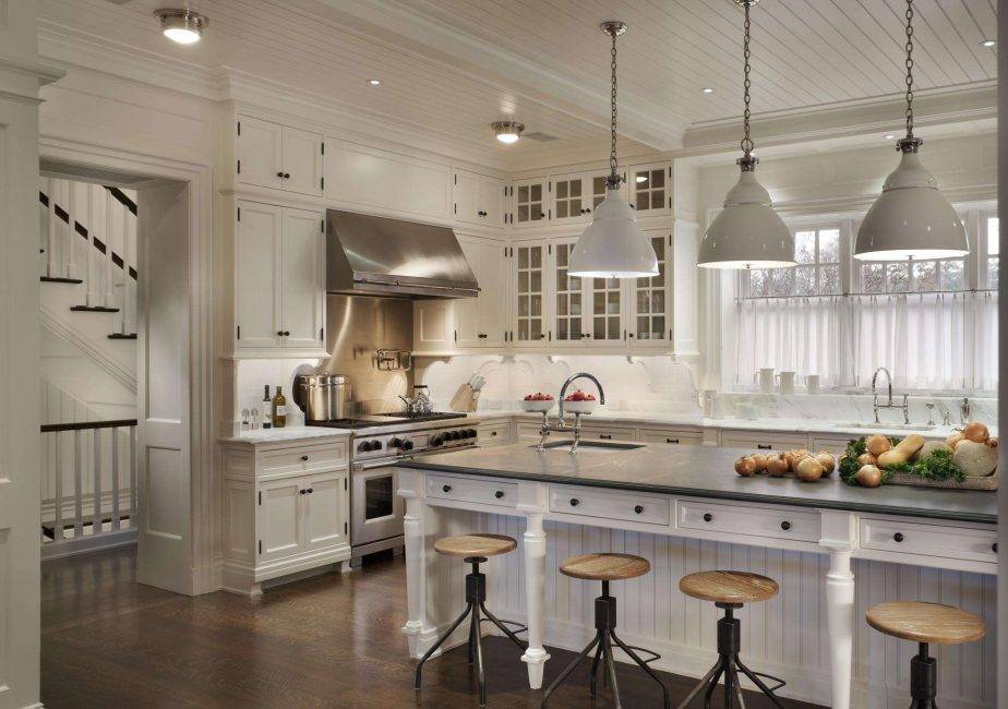 Как уже писалось выше, актуальны светильники в форме правильных геометрических фигур. Они могут быть разных размеров. На «белой» кухне будет отлично смотреться черная люстра с абажуром в форме конуса.
