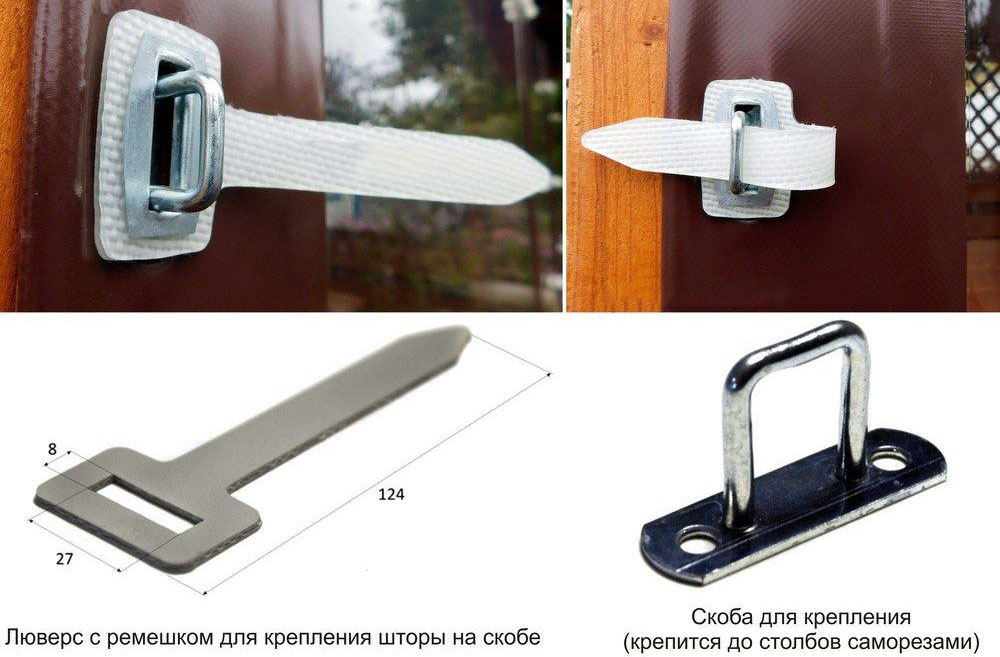 Конструкцию можно крепить различными методами, даже комбинированным. Поливинилхлоридные занавески крепятся саморезами с прессшайбой. По бокам размещают скобы и люверс с ремешком. Но есть ещё один способ, как установить надежное крепление.