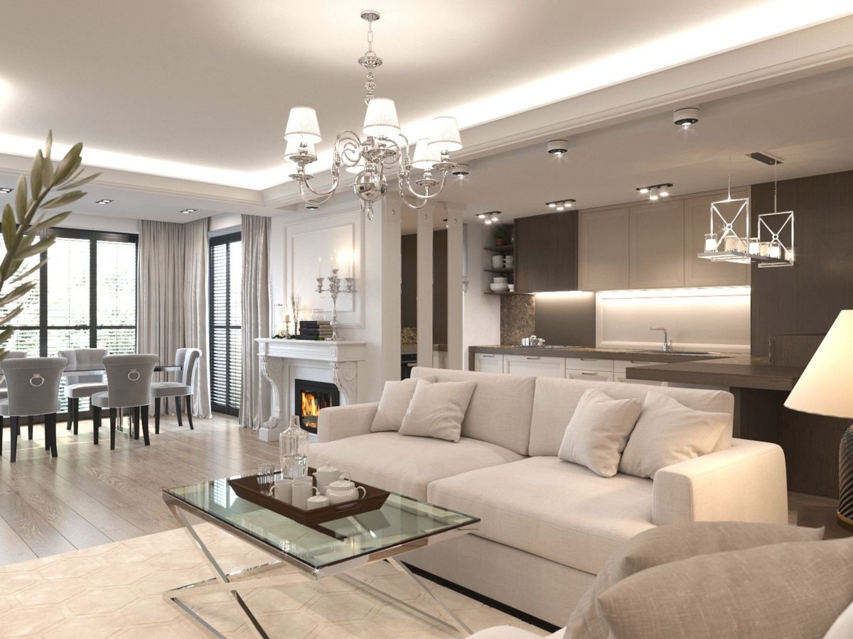 На фото — гостиная, дизайн которой выполнен в классическом стиле, совмещенная с кухней.