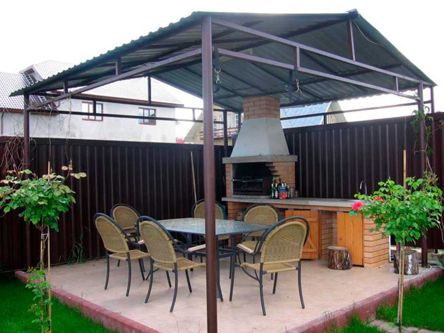 - открытая площадка обустраивается, когда свободного места на участке не так уж много, да и пикники проводятся нечасто. Для ее организации подойдет переносной мангал или барбекю, стол и навес над ним. При желании можно получить в итоге уютную зону отдыха, хоть и лишенную многих преимуществ закрытого варианта;