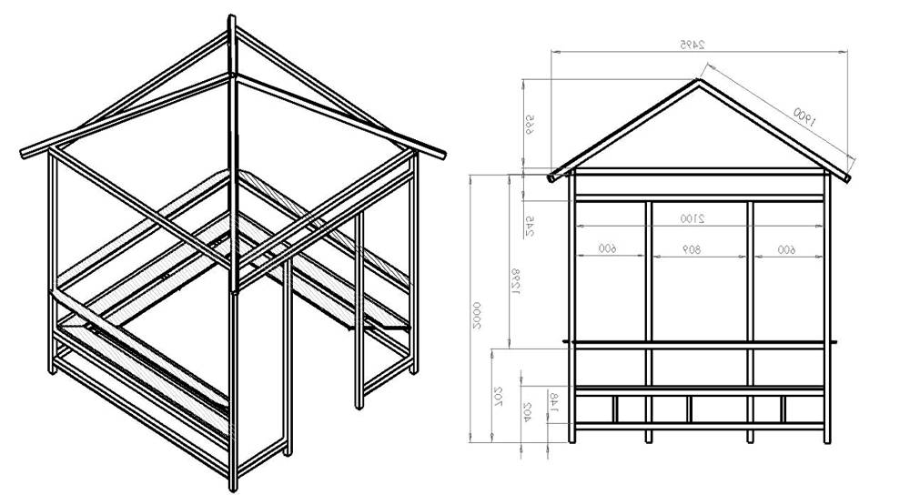 Боле устойчивая и одновременно более жесткая схема крыши мангала изображена на втором чертеже с размерами конструкции. Технология изготовления каркаса навеса аналогична предыдущему случаю, но вместо тяжелой трубы в ¾ дюйма, постройку можно сделать из полудюймового материала. Это позволит снизить вес и одновременно сделать конструкцию мангала с крышей переносной, безо всякого рода утяжелителей.