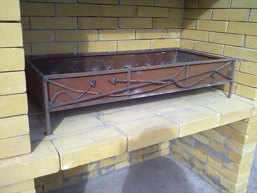 Основа для жаровни укладывается в пространстве между стенками конструкции. Для этого между ними могут размещаться металлические стержни или уголки, на которые будет выкладываться кирпичное основание. В качестве альтернативы можно использовать и поддон из толстого металлического листа.
