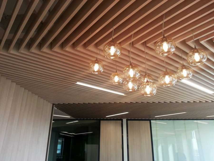- Приступают к монтажу светильников. Для потолков Грильято продают специальные приборы. Их размещают в свободные ячейки, подключают к проводам и фиксируют дополнительными подвесами в двух углах, находящихся по диагонали. Потолок полностью готов.