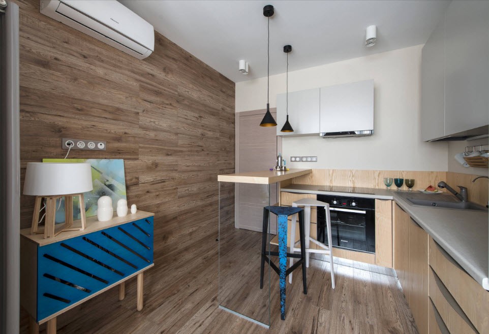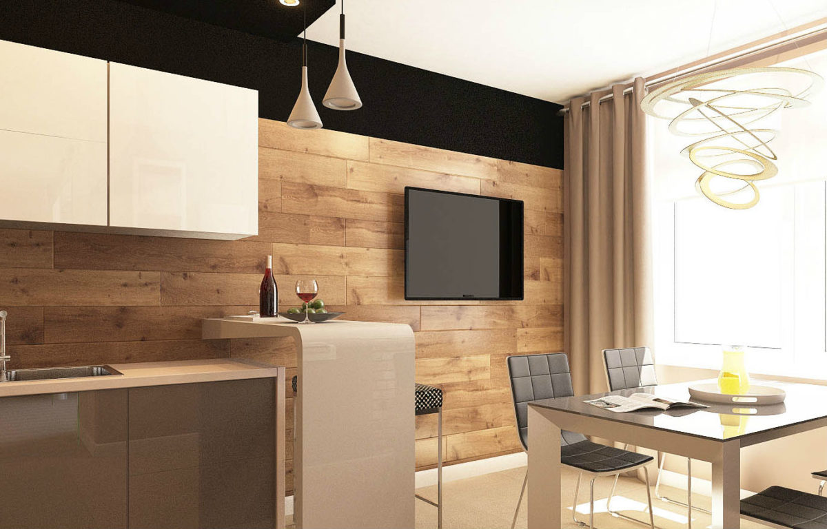- Зонирование с помощью отделки. Отделите обеденную зону от рабочей с помощью разных по фактуре или даже цвету отделочных материалов. Даже небольшое по площади помещение будет выглядеть оригинально.