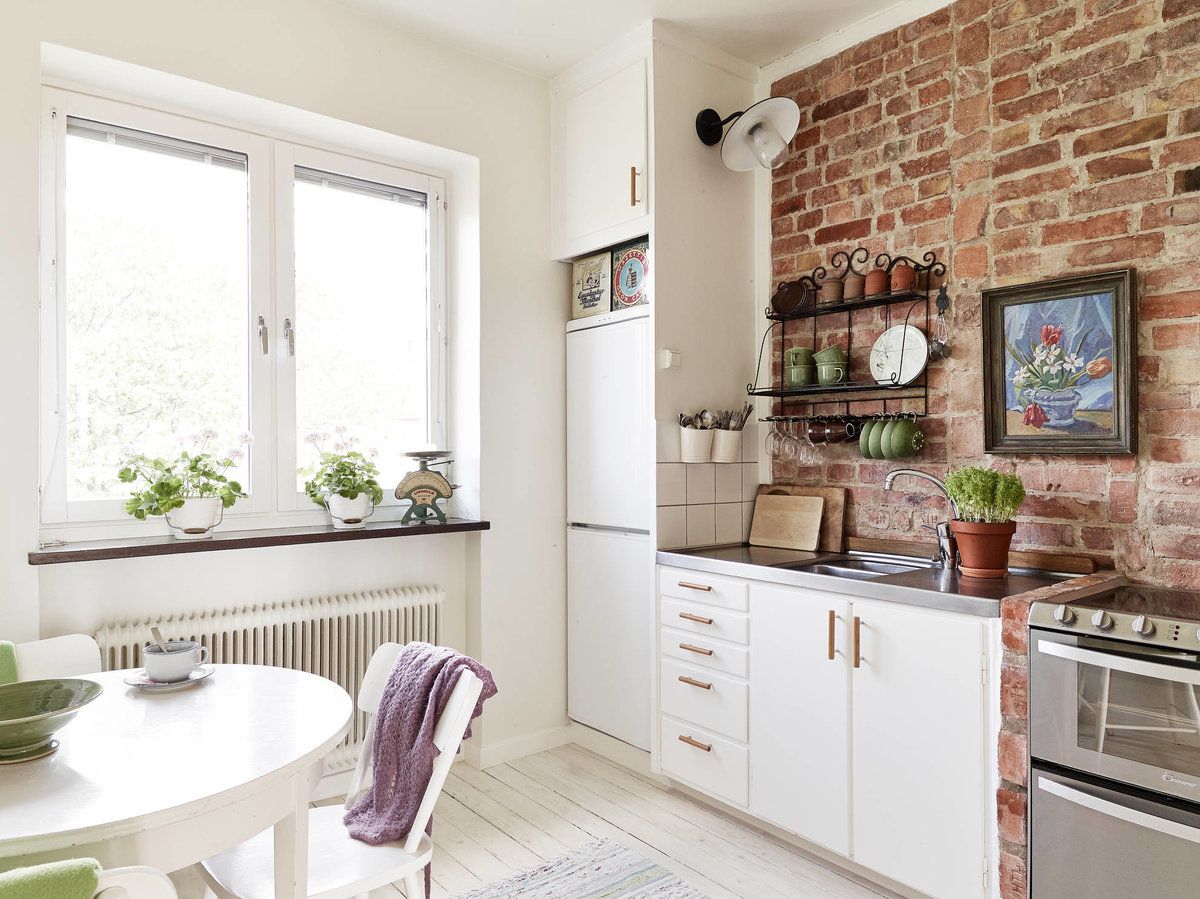 Белый кирпич — для романтических интерьеров, серый — для изысканных кухонь, а красный с оранжевым — для брутальной обстановки в стиле лофт. Необязательно оформлять стену в одном цвете — можно комбинировать кирпичики разных оттенков.