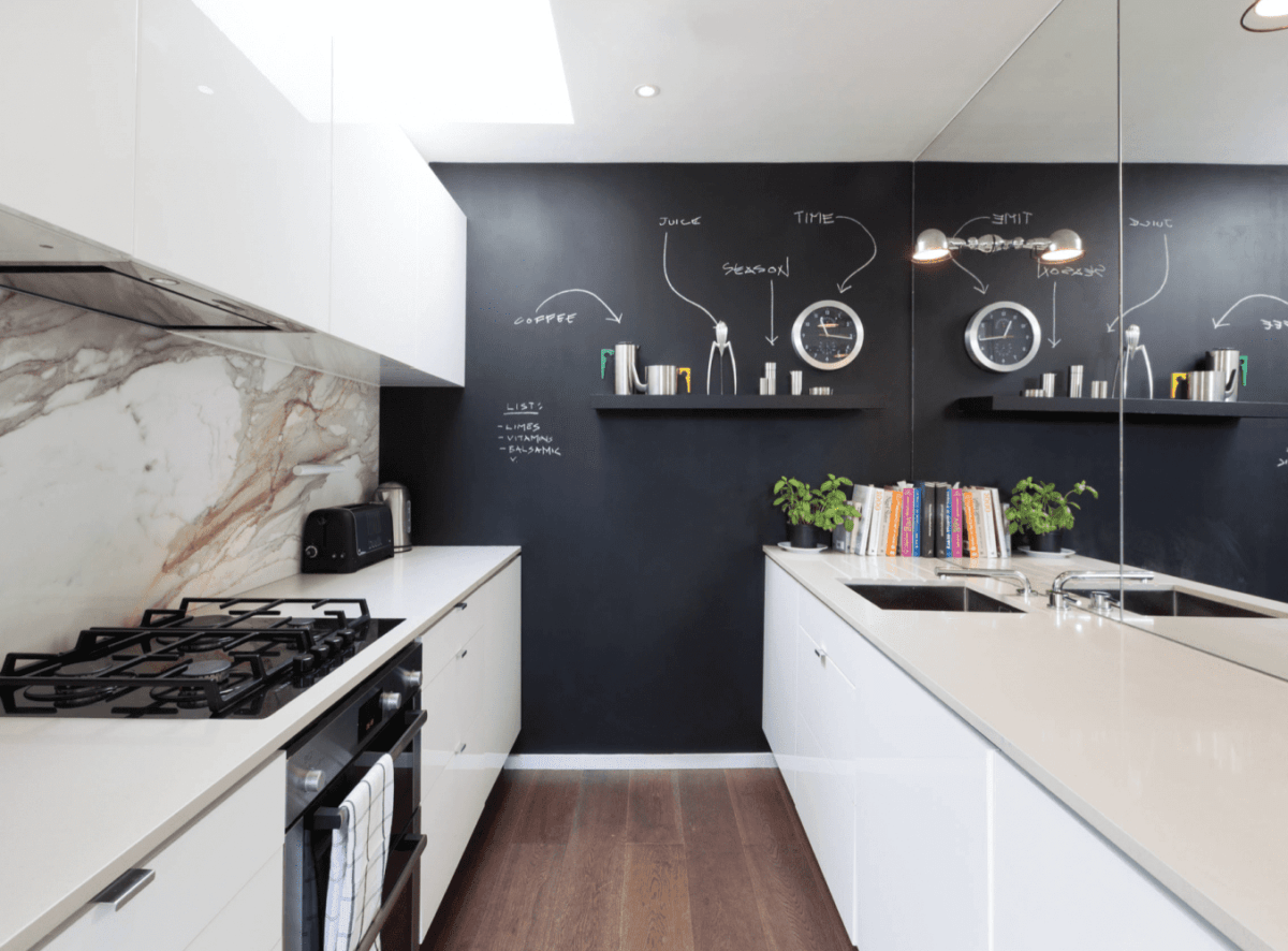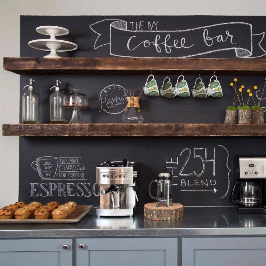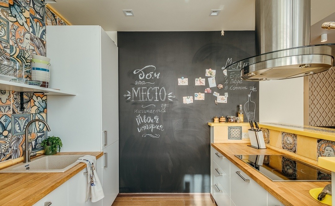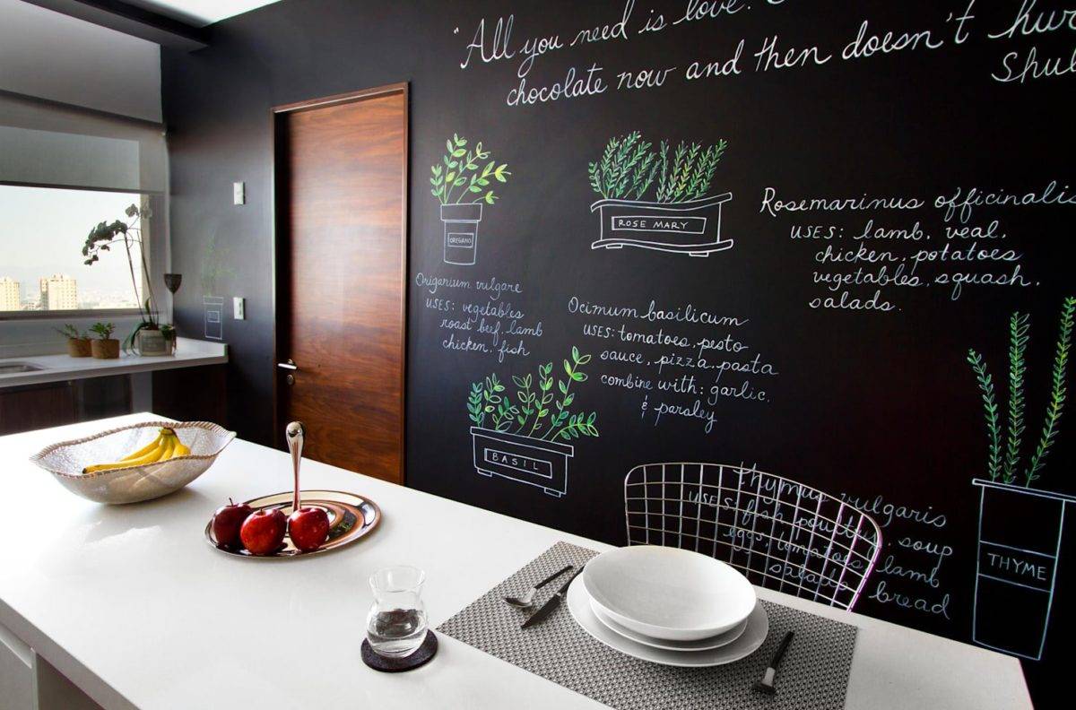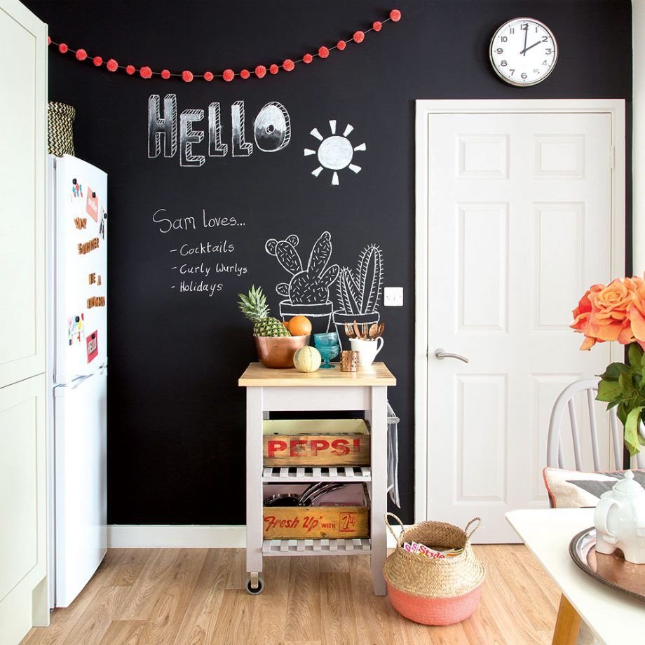 Украсить помещение и добавить интересный акцент на стену кухни можно при помощи доски для рисования. Не надо искать доску и прибивать на стену — достаточно закрасить нужную часть или стену полностью специальной графитовой краской.