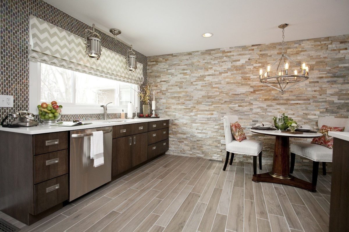 Порой бывает такое, что приходится использовать по разработанному дизайну интерьера нестандартные приемы. А точнее применять материалы не по прямому назначению. Так например, сегодня часто возникает необходимость вешать напольное покрытие на стену, в связи с отсутствием идентичного настенного материала. Таким образом делается своеобразное продолжение пола на стене, обычно фиксируют на стену ламинат или паркетную доску. Но для кухни больше подходит первый вариант, ведь он проще в уходе и меньше подвержен расслоению. Они схожи по конструкции с настенными панелями, поэтому легко монтируются.