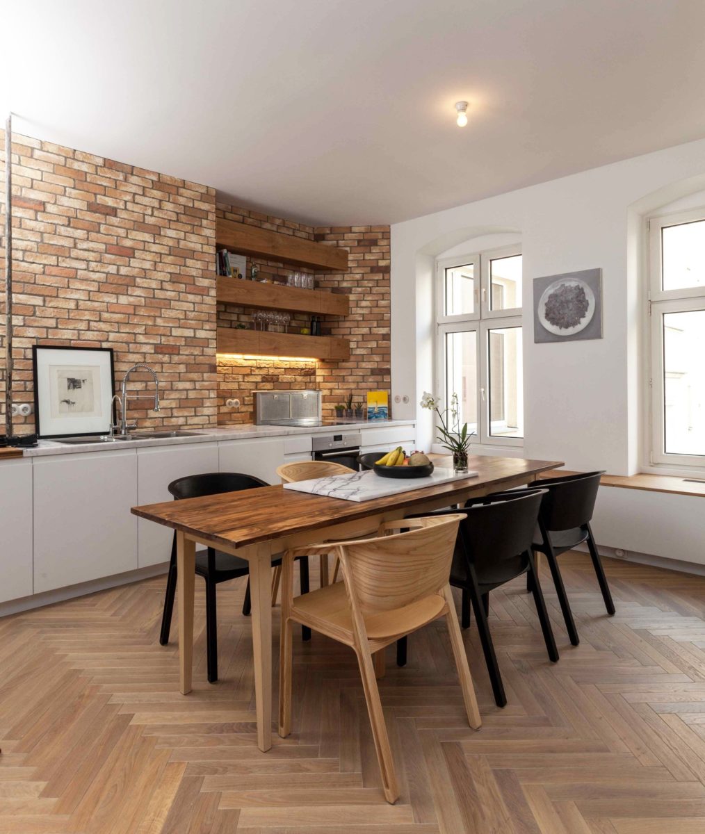 Современная керамическая плитка имитирует любые природные материалы, в том числе обожжённую глину. Отделка стен под кирпич — оригинальный вариант ремонта на кухне.