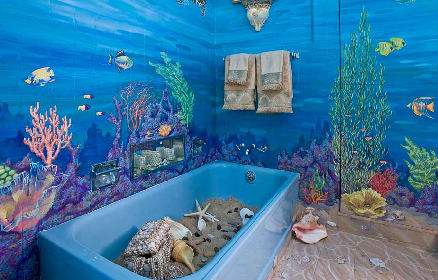 Если у человека, который решил сменить облицовку в ванной комнате, есть художественный талант, то окрасить стены можно при помощи различных рисунков.