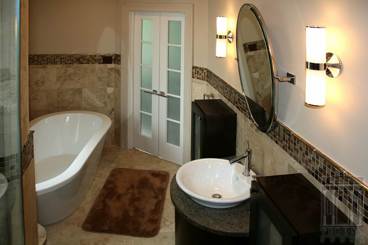 Каменная отделка создаёт в ванной комнате другую атмосферу, делает помещение изысканным и создает эффект дороговизны. Отделать помещение можно мрамором, ониксом или гранитом, которые отличаются невероятной прочностью, но подойдёт и искусственный камень. Это универсальный вариант, ведь он стоит дешевле натурального камня и открывает простор для декорирования. С помощью него можно оформить стену без швов. Отличается простым монтажом, легкой заменой поврежденных участков, устойчивостью к воде, разным температурам и вибрациям. Прочный, надёжный и простой в уборке вариант.