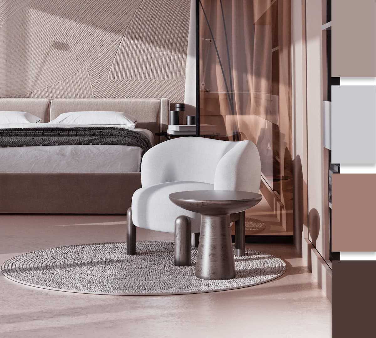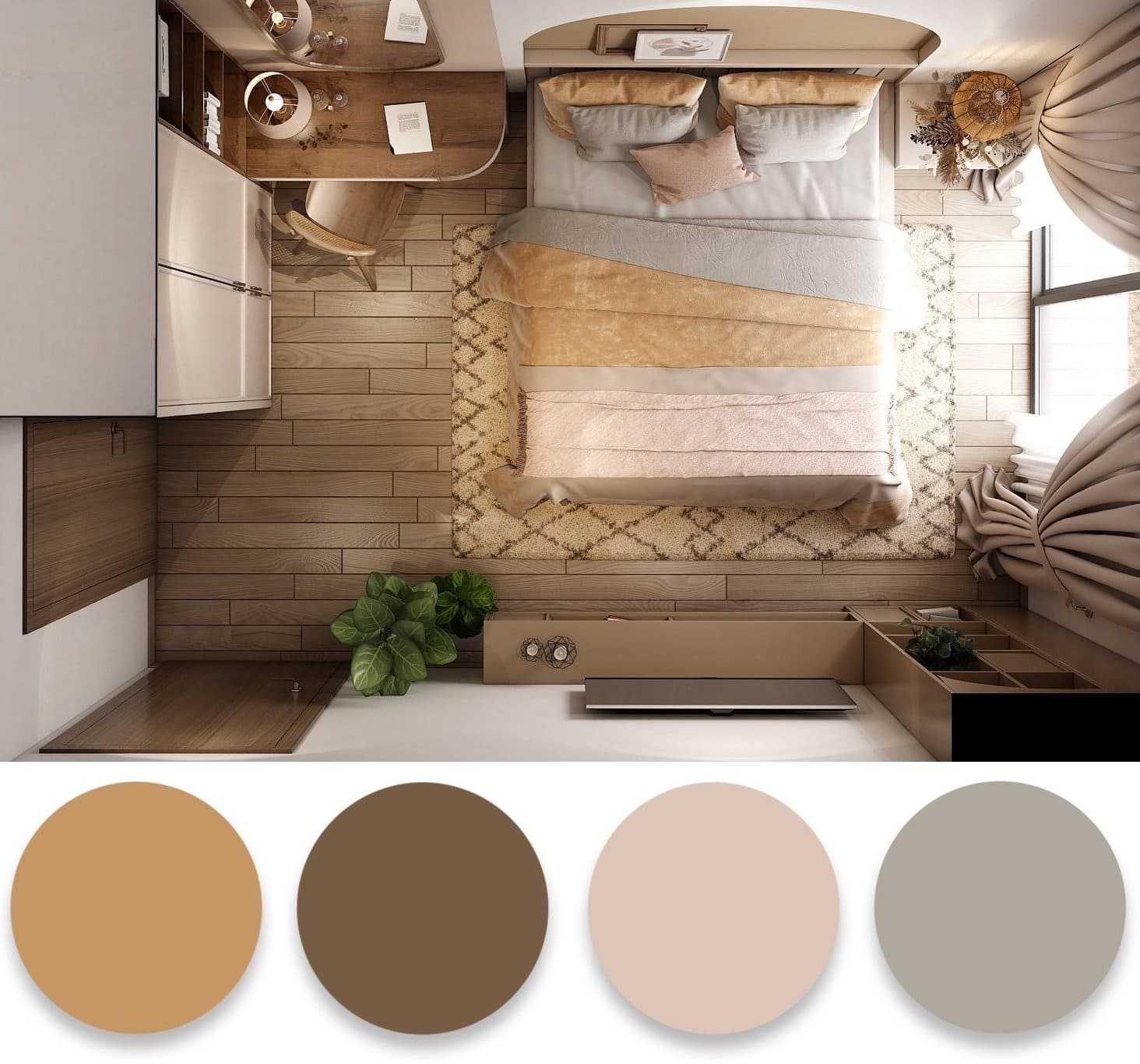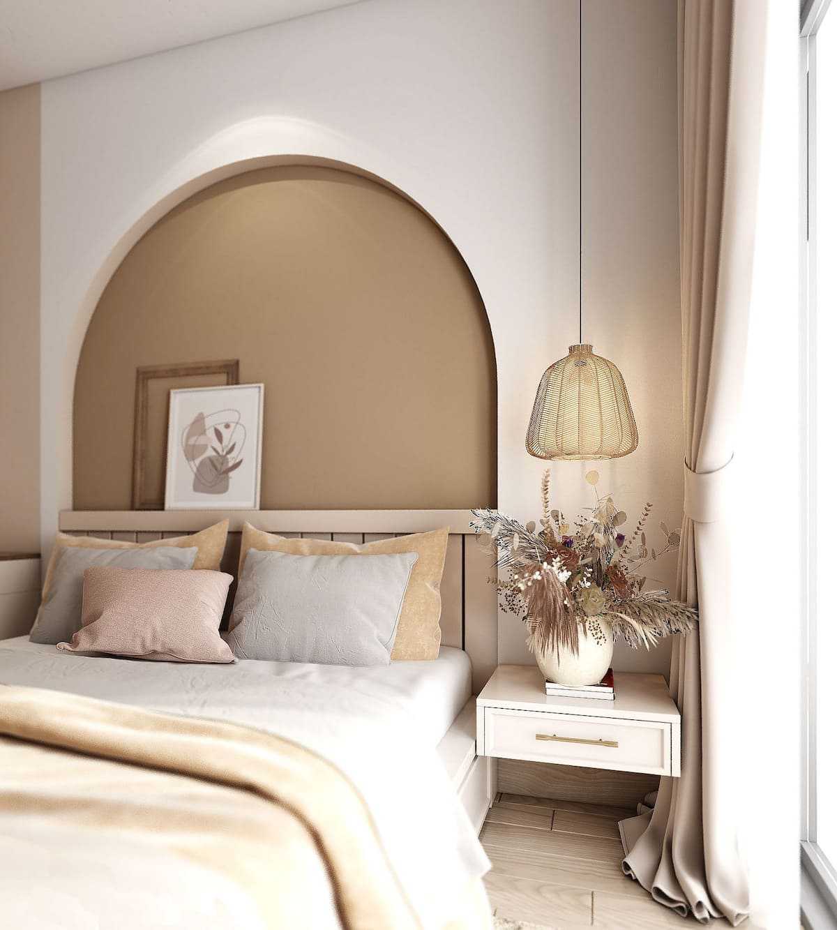 Часто совмещают ореховый цвет с белыми и бежевыми вставками. Такие сочетания подходят тем, кто желает добавить в спальню нежности, гармонии и романтического флера.