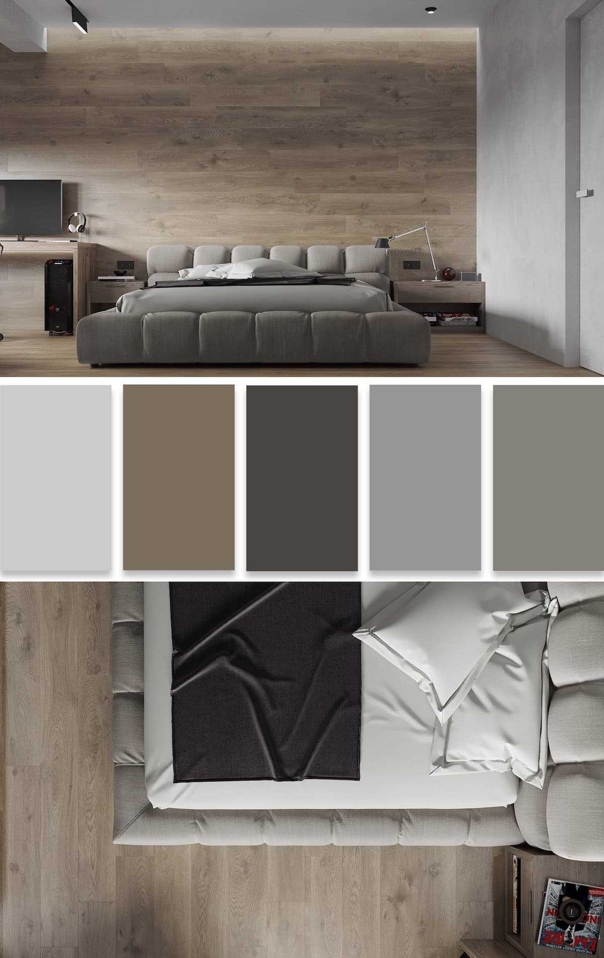 Предыдущие палитры можно без опасения разбавлять серым, бежевым и белым цветом. Любой из них будет красиво оттенять текстуру ореховых поверхностей.