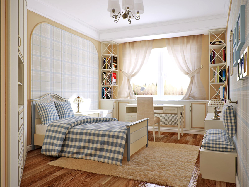 В любом случае свободное пространство должно оставаться. При планировании расположения мебели стоит учесть, что кровать лучше не ставить у радиаторов отопления или прямо у окна, а вот стол как раз лучше придвинуть к окну, причем солнечный свет должен падать с левой стороны, если ребенок правша, и наоборот, если левша. Про соответствие стола и стула росту даже говорить не стоит – это залог здоровья и правильной осанки. Не забываем и про искусственное освещение: лучше, если источников света будет несколько, например, общая люстра и лампа в зоне рабочего стола. Днем естественное освещение должно максимально проникать в комнату, поэтому в детскую лучше выбрать максимально легкие шторы, простые в управлении, но, в то же время, способные обеспечить затемнение, когда это нужно.