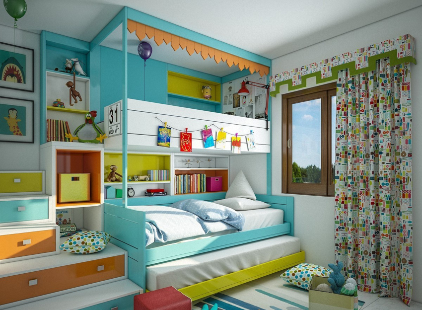 - Одна трехъярусная кровать (если позволяет высота потолка) или трехъярусная раздвижная кровать (если позволяет ширина комнаты).