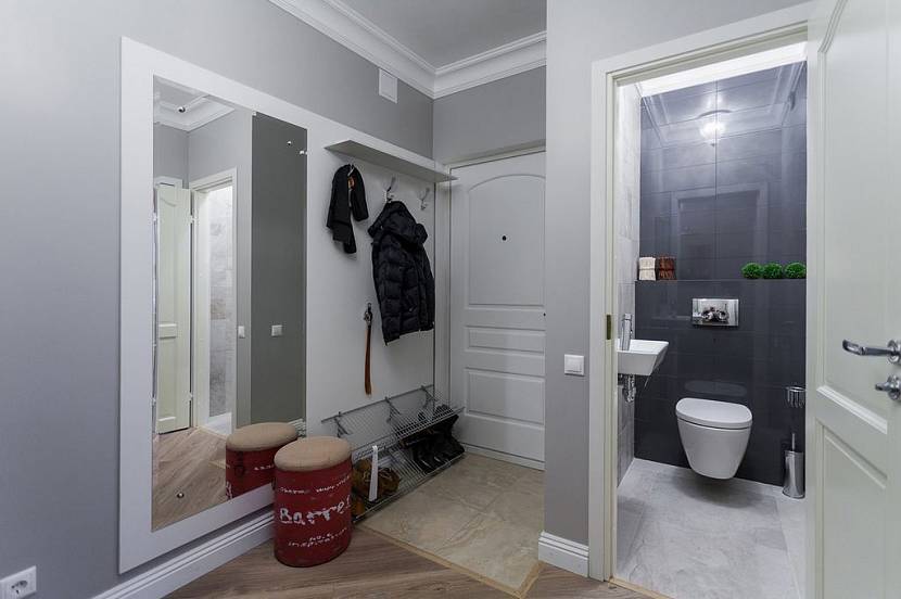 Необходимо учитывать и пространство для размещения одежды, хорошим вариантом станет шкаф с зеркалом, его комплектация может совмещать в себе несколько необходимых функций. В плане хранения мелких вещей этот предмет мебели точно необходим.